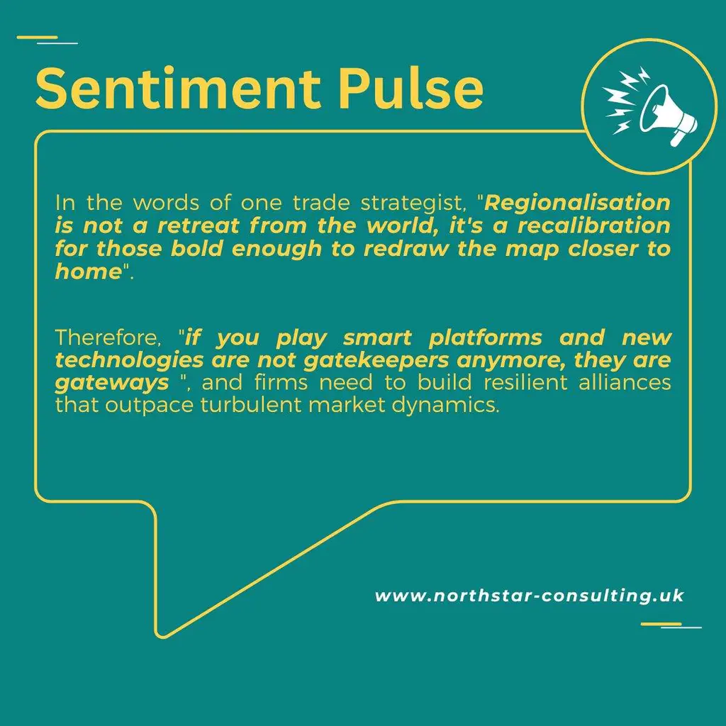 For UK and EU SMEs, the message is “the world is moving from recovery to realignment”. Supply chains are being redrawn, regional blocs are tightening, and the cost of distance, both financial and geopolitical, is rising. What once depended on scale and low-cost sourcing now depends on agility, proximity and intelligence.